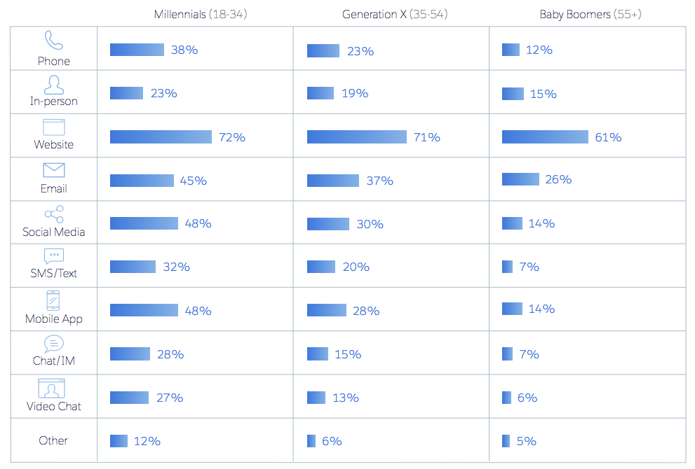 به نظر می رسد ۱۸ تا ۳۴ ساله ها (Millennials) بعد از گزینه جست و جو در وبسایتها، به کانال دیگری توجه بالا نداشته و میزان استفاده آنها از کانالهای مختلف ایمیل، شبکه های اجتماعی، اپلیکیشن ها و تلفن گستردگی دارد.