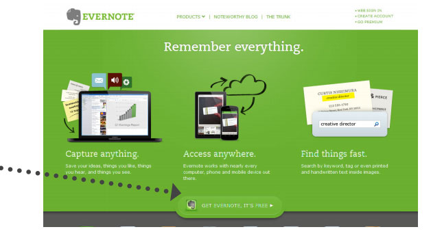 به تصویر زیر دقت کنید، سایت Evernote طراحی زیبایی دارد اما فراخوانی به عمل اولیه برای نسخه رایگان آنها در این طرح مدفون شده است. زیرا از همان رنگ سبز پس زمینه استفاده کرده اند.
