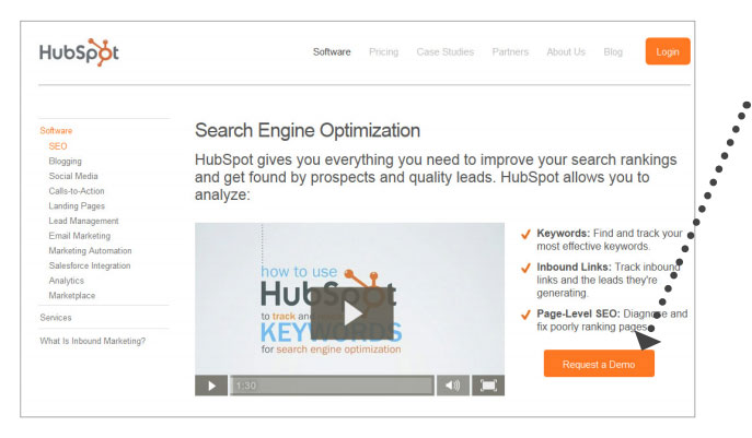 در مثال زیر، یک CTA برای “درخواست نسخه دمو” در صفحه محصول قرار داده شده است. برای ایجاد بیشتر لید، ممکن است حتی فراخوانی به اقدامی برای “راهنمای رایگان سئو” عرضه کنیم زیرا به پیشنهادی که در این صفحه ارائه شده مرتبط است.