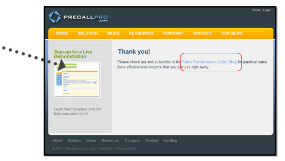 وبسایت PrecallPro فراخوانی به اقدام ثانویه ای برای قدردانی از لید جذب شده در صفحه تشکر از عضویت خود ارائه کرده است.