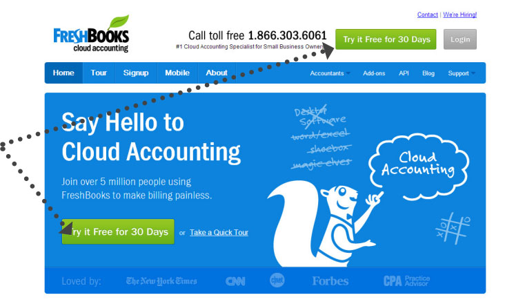 در تصویر زیر، به فراخوانی به اقدام اولیه در صفحه اصلی سایت Freshbooks توجه داشته باشید. دو گزینه ” استفاده رایگان برای ۳۰ روز ” در بالای فولد قرار گرفته است.